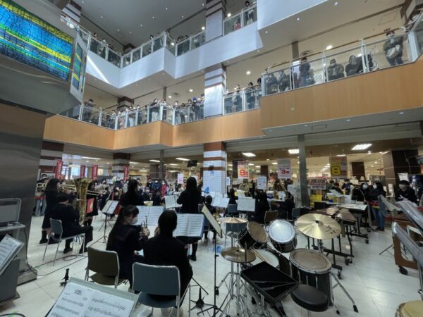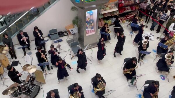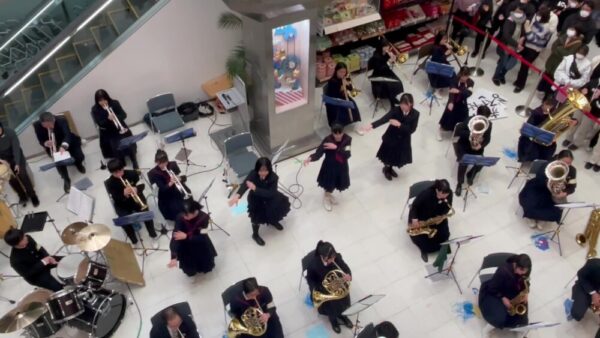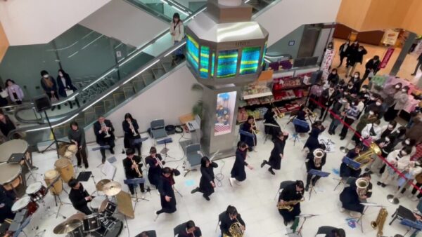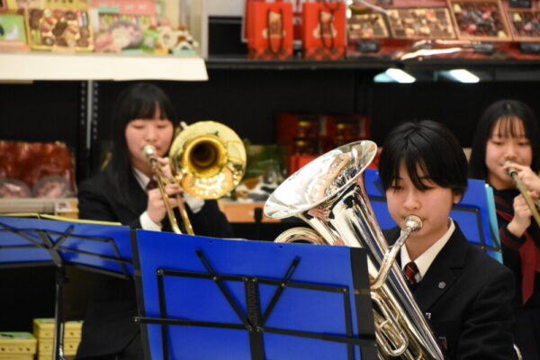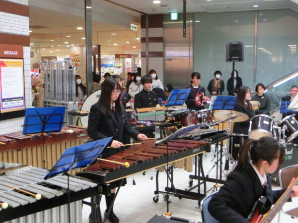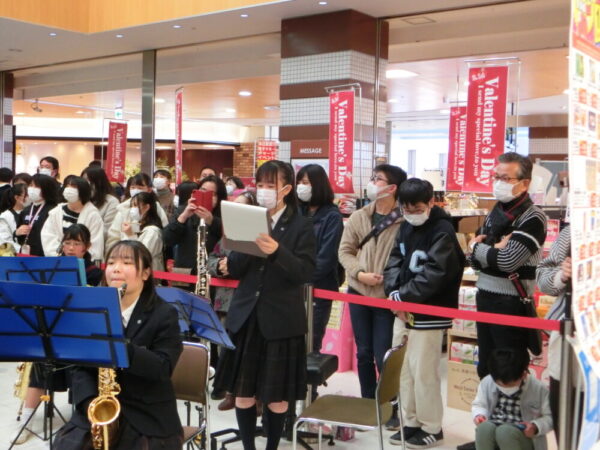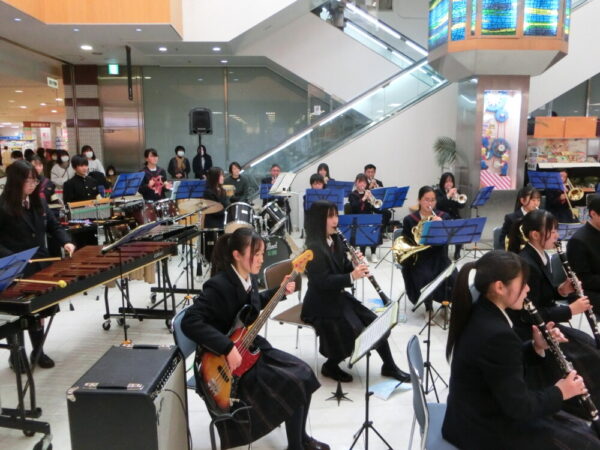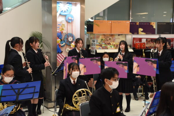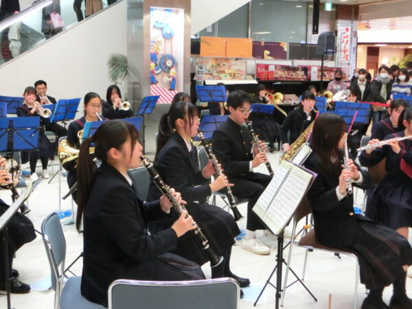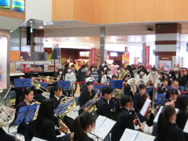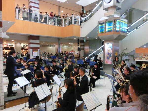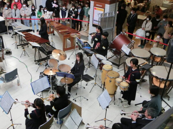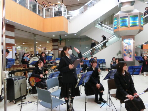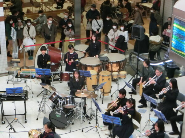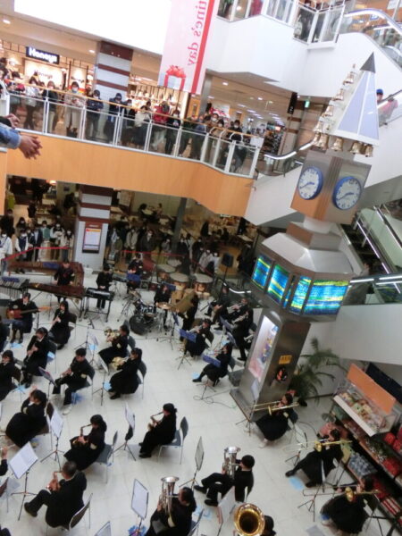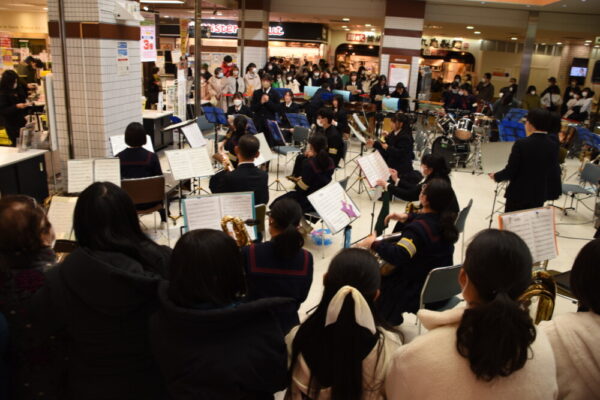 山梨県立富士河口湖高等学校 > 部活動 > 吹奏楽 > 【吹奏楽部】Winter Concert 2023 in BELL を開催しました! 2023年1月30日カテゴリー: 部活動 吹奏楽 【吹奏楽部】Winter Concert 2023 in BELL を開催しました! 1月29日(日)、河口湖ショッピングセンターBELLにて、Winter Concertを開催しました。 今回は、下吉田中学校吹奏楽部との合同ステージ。11:00~と14:00~の2回公演を行いました。 午前ステージも午後ステージも、ともに大盛況でした! 私たち出演者も、予想以上のお客様の数にとても驚いたのとともに、とても嬉しくて、楽しい気持ちになりました! お越しくださった皆さま、本当に本当にありがとうございました!! 今回の演奏曲は、 ①ミックスナッツ/Official髭男dism ②ベテルギウス/優里 ③J-POP~冬うた~(ゲレンデがとけるほど恋したい・粉雪・夜空ノムコウ・雪の華・Choo Choo Train) ④ディズニーアンサンブル ⑤I LOVE …/Official髭男dism ⑥川の流れのように ⑦昭和アイドル・コレクション(夏色のナンシー・ダンシングヒーロー・セーラー服を脱がさないで・赤いスイートピー・なんてったってアイドル) ⑧新時代 (アンコール)宝島 でした! 来ていただいた皆さま、お楽しみいただけたでしょうか?? 本日の司会は、河高1年クラリネットパート渡邊愛菜美さんと 同じく河高1年クラリネットパート日向碧さんでした! 今回河高生は、3チームに分かれてアンサンブルメドレーを演奏しました! 実は、午前と午後で演奏曲が微妙に違ったのですが、お気づきになりましたでしょうか?? <金管五重奏で、美女と野獣> <マリンバ三重奏+カホン伴奏で、アンダー・ザ・シー> <クラリネット五重奏で、ホール・ニュー・ワールド> 歌にダンスに、ただ演奏するだけではなく、見て楽しめるように工夫をしました! <雪の華をうたうのは、まほさん・のあさん> <新時代ダンスチーム> 本当にたくさんのお客さんで、各階フロアが埋め尽くされていました! 今回こうして3年ぶりとなるBELLでの演奏会ができて、部員たちも本当に楽しんでいました。 一緒に演奏してくれた下吉田中学校吹奏楽部の皆さん、本当にありがとうございました! 私たち河高吹奏楽部にとって次のステージは、2月12日(日)に開催される南都留吹奏楽祭です。 これからも、河高吹奏楽部、頑張ります!