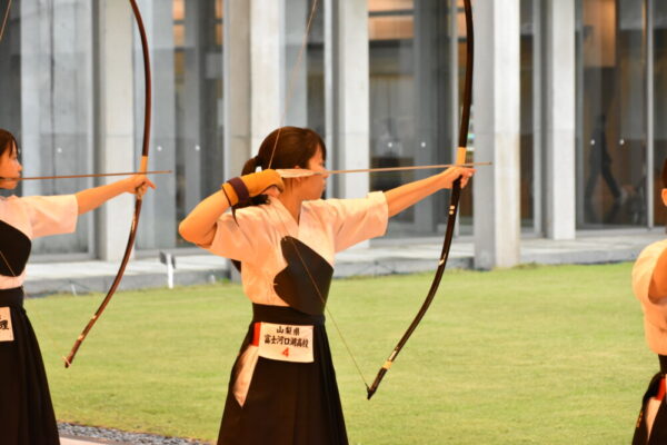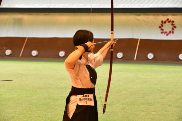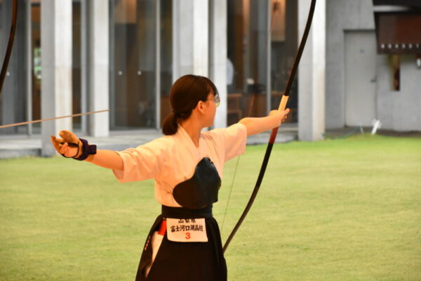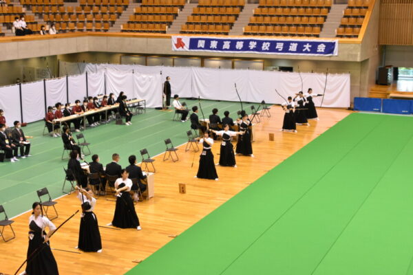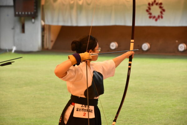 山梨県立富士河口湖高等学校 > 部活動 > 弓道 > 【弓道部(FKQC)】関東大会in埼玉(2日目) 2023年6月3日カテゴリー: 部活動 弓道 ◆大会結果◆ 【弓道部(FKQC)】関東大会in埼玉(2日目) 6月3日の日程は、いよいよ本番の行射です。 朝一で近的射場に入り、スケジュールに従って練習し、そのまま本番の行射に向かいます。 立順によって練習開始時間も決まっているので、まさに分刻みです。 結構焦って支度していました。 選手の皆さんお疲れ様です。 アリーナで行われる試合は、4射を2回行い、合計24射中の的中数で決勝トーナメントに進めるかどうかが決まります。 河高チームは、合計12射で上位14位タイに入りました。12中のチームは7チームいたため、競射により2チームが選出されました。 河高チームは惜しくも、競射で敗れてしまいました。 埼玉まで来てくださり、応援してくださった保護者・コーチの皆さん。ありがとうございました。 この経験を、次の大会に生かせるように、今後も精進したいと思います。 ~朝一の公式練習です~ ~一回目の行射です~ 十分な朝練ができず、いつもとは違う環境、ホームでない環境に戸惑いがありました。 それでも選手は、集中して、一射一射丁寧に引きます。 ~巻き藁の様子です~ ~二回目の行射です~ コーチと話をして、落ち着きを取り戻したようです。 一回目より調子が良きですね。 ~競射です~ 選手たちは、最後の一本まで全力で引き切りました。 終わったとき、選手はそれぞれすべてを出し切ったを言う顔をしており、 不思議と悔しさはなかったと言います。 惜しくも決勝には進めませんでしたが、全力で勝負に臨んだ選手の皆さん、お疲れさまでした。 応援してくださったみなさん、ありがとうございました。