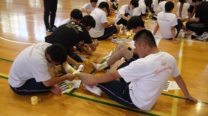 講師の先生方の説明や指導を受けながら、生徒はテーピングと格闘していました。これまで部活動などでテーピングを巻くことはありましたが、今回初めて基本から手ほどきを受けることができました。