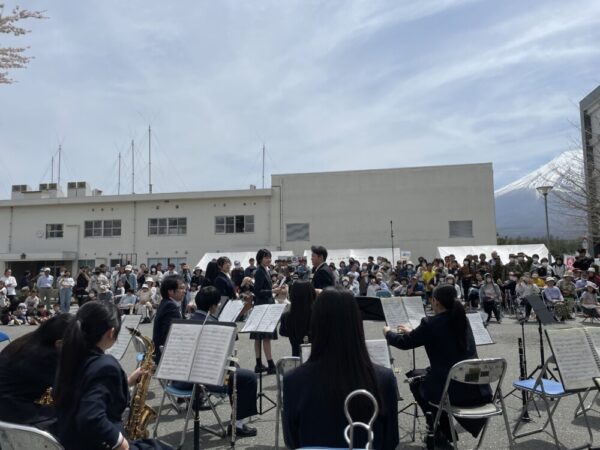 山梨県立富士河口湖高等学校 > 部活動 > 吹奏楽 > 【吹奏楽部】自衛隊北富士駐屯地祭 2024年4月20日カテゴリー: 部活動 吹奏楽 【吹奏楽部】自衛隊北富士駐屯地祭 4月20日(土)に、陸上自衛隊北富士駐屯地64周年記念行事に参加しました。 私たち河高吹奏楽部は、午後のアトラクションステージに出演しました。 今回は、富士北稜高校、吉田高校、都留興譲館高校の地元高校吹奏楽部に加え、陸上自衛隊第一音楽隊の皆様と、合同演奏することができました。 第一音楽隊の皆様と共演するのは、2019年以来実に5年ぶりでした! そして、今回のこのステージが2024年度一発目の本番でした! さらには、楽器運搬のお手伝いで来てもらった進入部員の1年生にも、ダンスチームとして緊急参戦してもらいました! 高校生ステージ 第一音楽隊の皆様と合同演奏 昼食オフショット 駐屯地の桜が満開でキレイでした! 前日には、河高に集まり、合同練習を行いました。 パートごとでワンポイントレッスンも行ってもらいました!