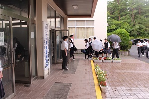あいにくの雨模様の朝でしたが、登校してくる生徒たちに元気よく声をかけていました。生徒たちも笑顔であいさつに応えていました。