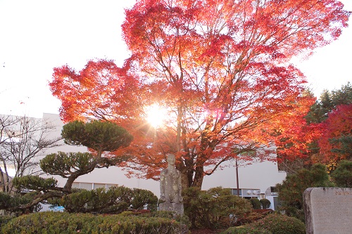 <朝日に輝くいろはもみじと「健」ちゃん像>
