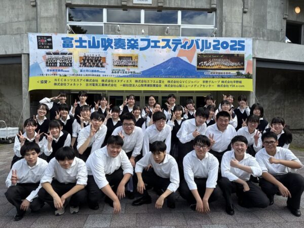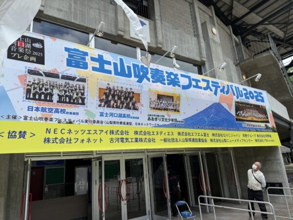 山梨県立富士河口湖高等学校 > 部活動 > 吹奏楽 > 【吹奏楽部】富士山吹奏楽フェスティバル 2025年6月17日カテゴリー: 部活動 吹奏楽 【吹奏楽部】富士山吹奏楽フェスティバル 6月15日(日)に、富士山吹奏楽フェスティバルに出演しました! お越しいただいた皆様、ありがとうございました! 富士山吹奏楽フェスティバル2025 日時:6月15日(日) 会場:河口湖ステラシアター 出演:あおぎり文化少年団吹奏楽部 富士河口湖高校吹奏楽部 日本航空学園高校吹奏楽部 伊奈学園総合高校吹奏楽部(ゲスト) 河高演奏曲: ①シロクマ ②ティアエスの祈り~奏楽は靡き星は煌めく ③怪獣の花唄 ④「君の名は。」コレクション 例年お客さんとして鑑賞していたこのイベントですが、第4回目の今年は出演者として参加させていただきました! 昨年の12月に出演することが決定し、演奏曲や演出などを長い期間をかけて準備してきました。 また本番に際しても、前日の楽器搬入や当日の朝早いリハーサルなど、大忙しでした。 例年鑑賞させていただく中で、ゲスト校の演奏はもちろん、県内の出演校もトップレベルの演奏をしていたため、私たちは正直プレッシャーの中での出演でした💦 …が、無事に本番を終えられ、また演奏を聴いていただいた吹奏楽関係者の皆様から好評をいただき、とても満足感と自信になりました! 本当にありがとうございました! この日の演奏曲の中には、今年の吹奏楽コンクールで演奏する予定の曲もあり、気合を入れて準備してきました! ここ数日の中で、一番に良い演奏ができました! これから先も、まだまだ河高吹奏楽部の演奏がありますので、ぜひまた演奏を聞いていただけたら幸いです!